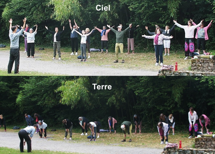 Notre corps et notre esprit se relient au ciel et à la terre pour un échange réciproque en synchronisation avec la respiration et en associant des sons.
